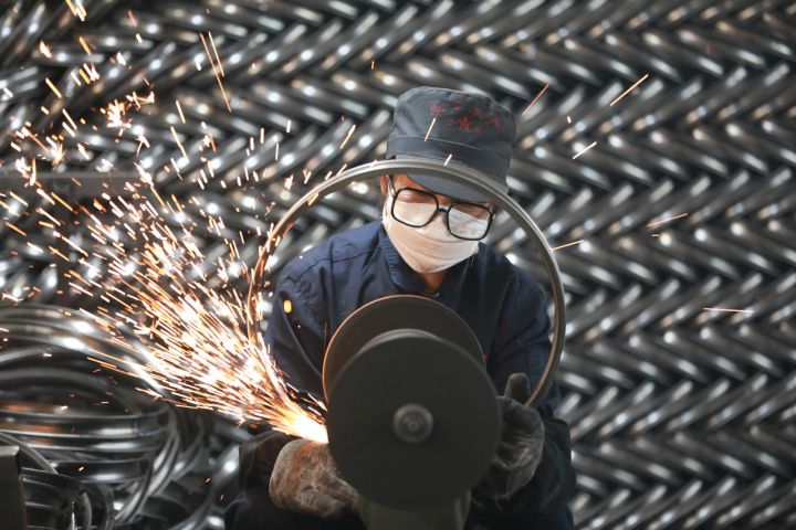 10月5日,在杭州市临安区天目山镇一家外贸企业,工人对销售海外的自行车钢圈进行抛光作业。胡剑欢 摄