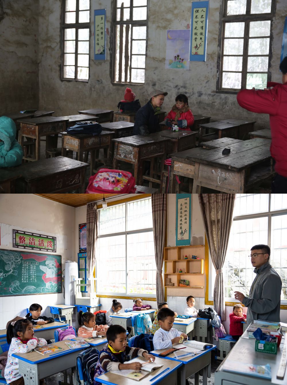 拼版照片:上图为过去十八洞村小学内景(资料照片);下图为2023年10月20日拍摄的翻修后的十八洞村小学内景(新华社记者陈思汗摄)。新华社发