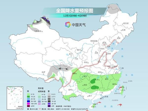 后天,内蒙古东北部、黑龙江西北部、新疆北疆北部和北疆东部、西藏东部、青海南部、川西高原北部等地部分地区有小到中雪或雨夹雪,其中,新疆北疆部分地区有大到暴雪,局地大暴雪。四川盆地、重庆、湖南、江西、浙江南部、福建、广西北部、广东北部、云南南部、海南岛、台湾岛等地部分地区有小雨,其中,湖南中西部和南部、广西东北部等地部分地区有中雨。