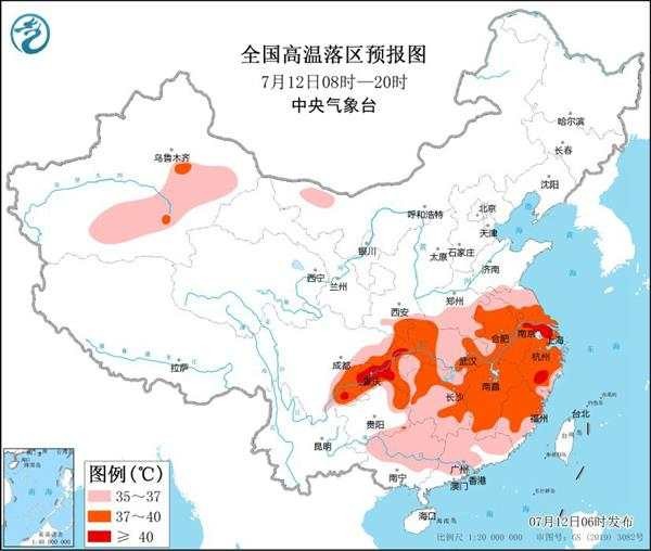 预计7月12日白天,新疆南疆盆地、陕西南部、黄淮南部、西南地区东部、江汉、江淮、江南、华南等地有35℃以上高温天气,其中,安徽、江苏中南部、上海、湖北西部和东南部、湖南北部和东部、江西、浙江、福建大部、四川盆地东南部、重庆、贵州东北部等地的部分地区最高气温37~39℃,江苏南部、上海北部、浙江南部、四川盆地东南部、重庆中西部和北部局地可达40℃以上。