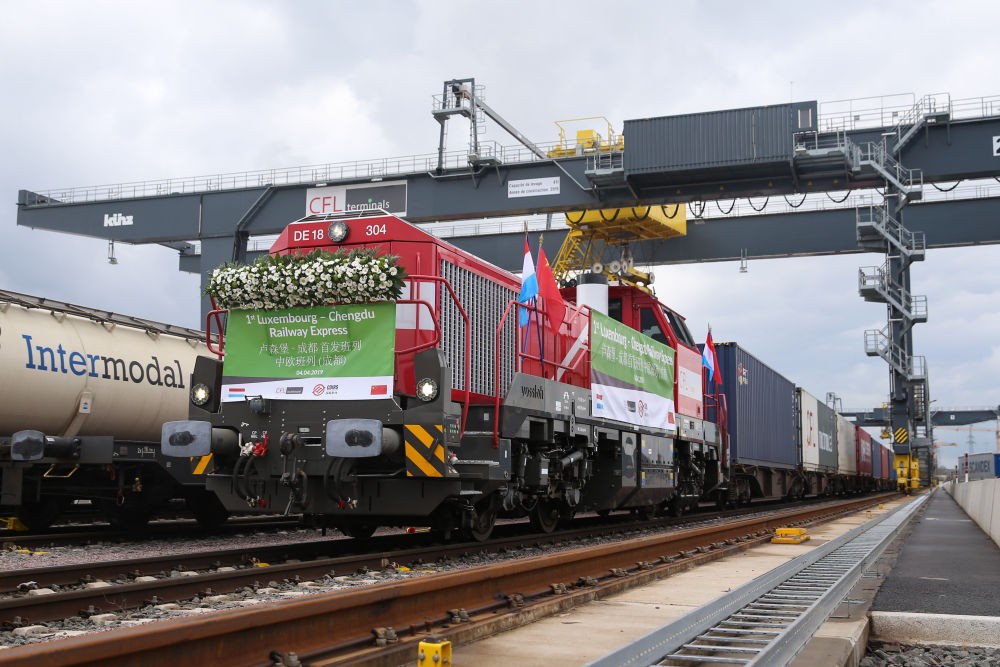 2019年4月4日,首趟卢森堡至成都中欧班列在卢森堡迪德朗日铁路场站准备出发。班列途经德国、波兰、白俄罗斯、俄罗斯、哈萨克斯坦等国,由中国新疆阿拉山口口岸入境。