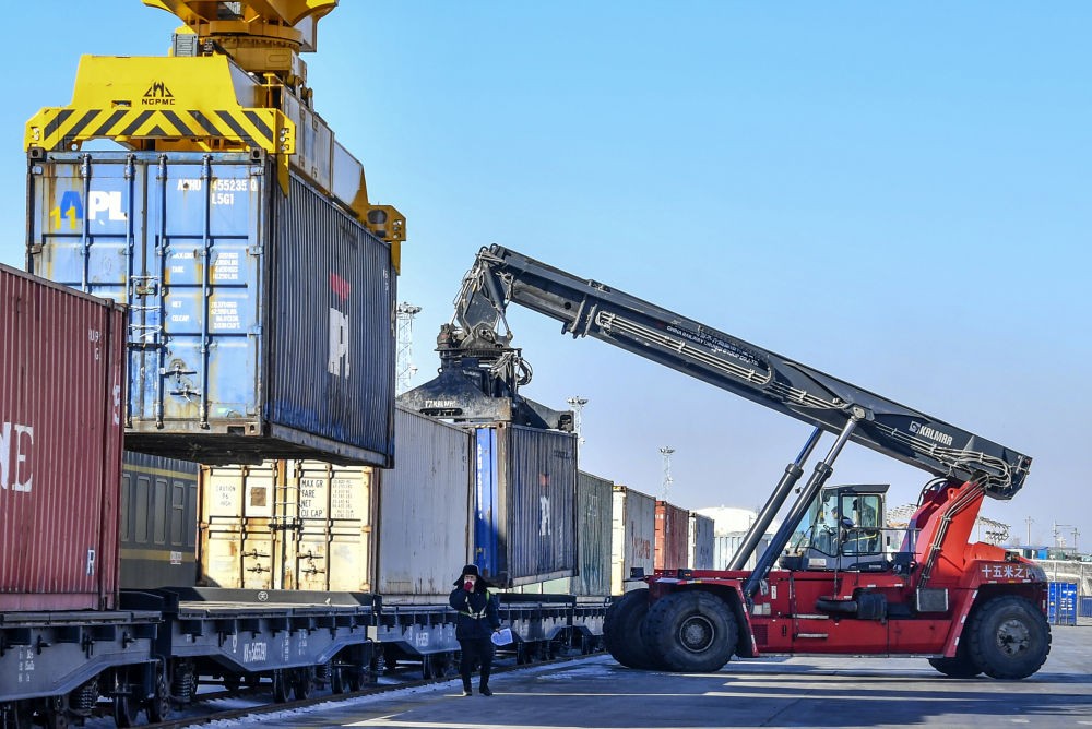 工人在中欧班列(乌鲁木齐)集结中心吊运货物。