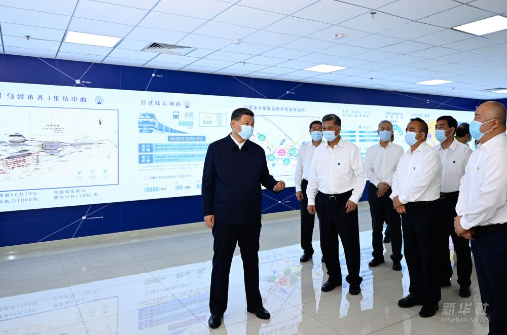 习近平总书记12日下午来到乌鲁木齐国际陆港区,听取整体情况介绍,通过实时画面察看中欧班列(乌鲁木齐)集结中心各功能区和阿拉山口口岸、霍尔果斯口岸现场作业情况,并同工作人员及现场办事人员亲切交流。