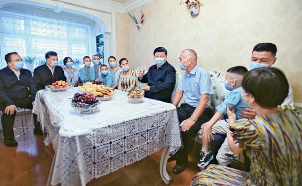 2022年7月12日至15日,中共中央总书记、国家主席、中央军委主席习近平在新疆考察。这是13日上午,习近平在乌鲁木齐市天山区固原巷社区,同维吾尔族居民阿布来提·吐尔逊一家人围坐在一起拉家常。 新华社记者 谢环驰/摄