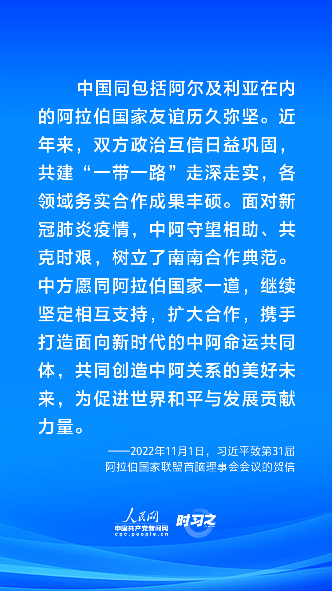中国与阿拉伯国家友谊源远流长,历久弥坚。和平合作、开放包容、互学互鉴、互利共赢始终是中阿交往的主旋律。习近平主席多次在不同场合谈到中阿友谊,提出携手打造面向新时代的中阿命运共同体,积极推动中阿命运共同体建设不断走深走实,造福双方人民。