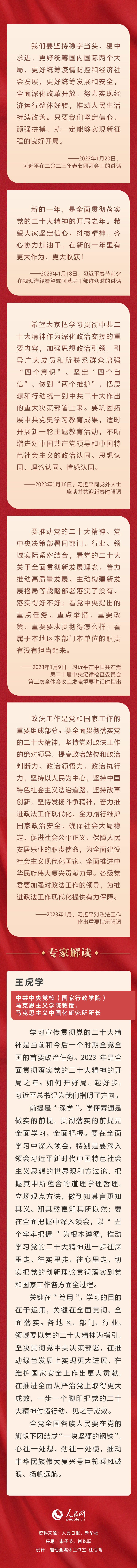 “2023年是全面贯彻党的二十大精神的开局之年,希望与挑战并存。”1月,中共中央总书记、国家主席、中央军委主席习近平在多个场合发表重要讲话,为全面贯彻党的二十大精神指明方向。人民网带您一同回顾,并邀请专家进行解读。