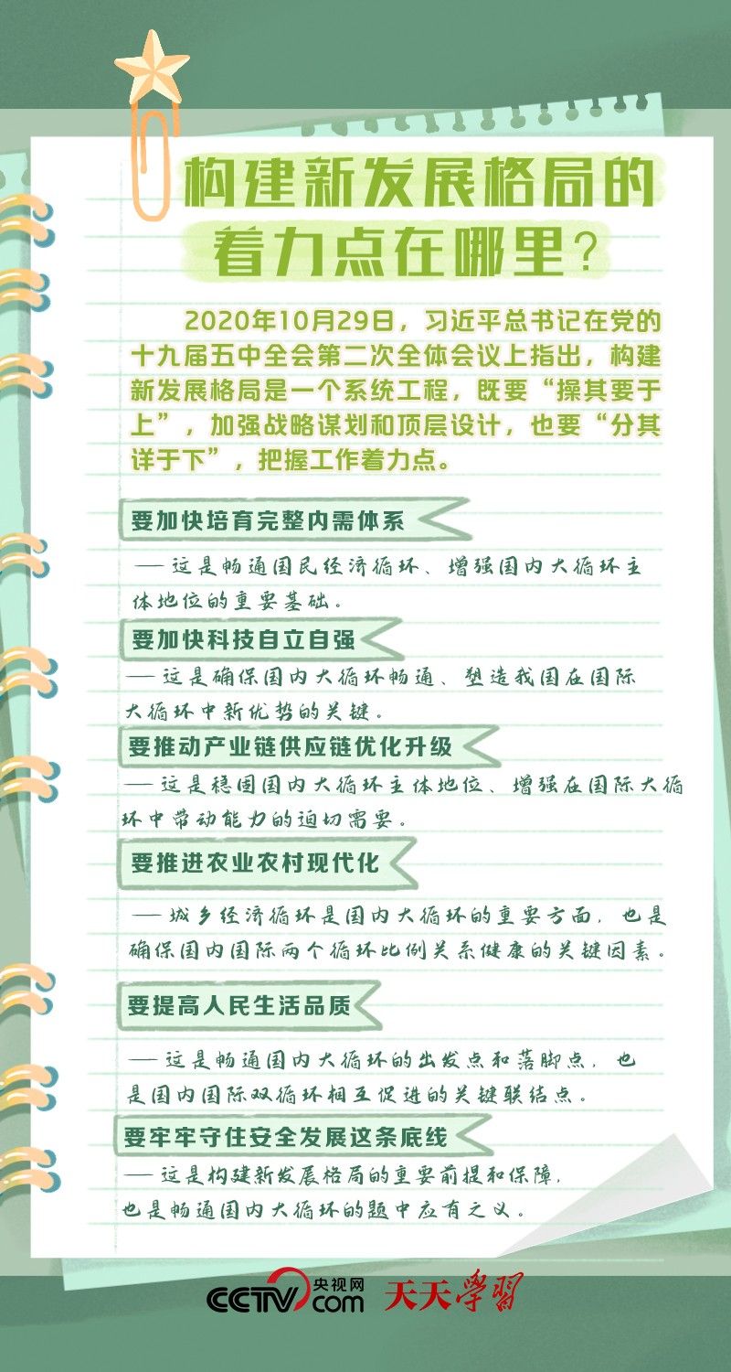 天天学习构建以国内大循环为主体、国内国际双循环相互促进的新发展格局,是根据我国发展阶段、环境、条件变化,特别是基于我国比较优势变化,审时度势作出的重大决策。构建新发展格局是事关全局的系统性、深层次变革,是立足当前、着眼长远的战略谋划。