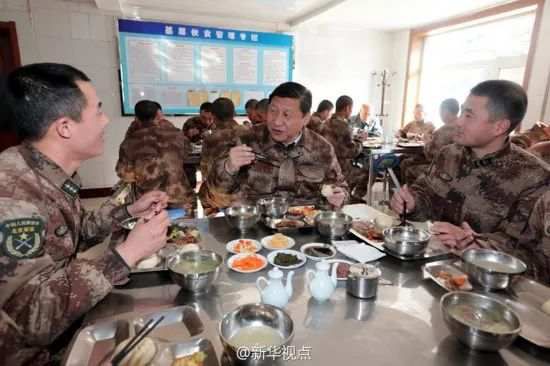 2014年1月26日,习近平来到内蒙古军区边防某团一连食堂,同战士们一起用餐。(图源:新华社)