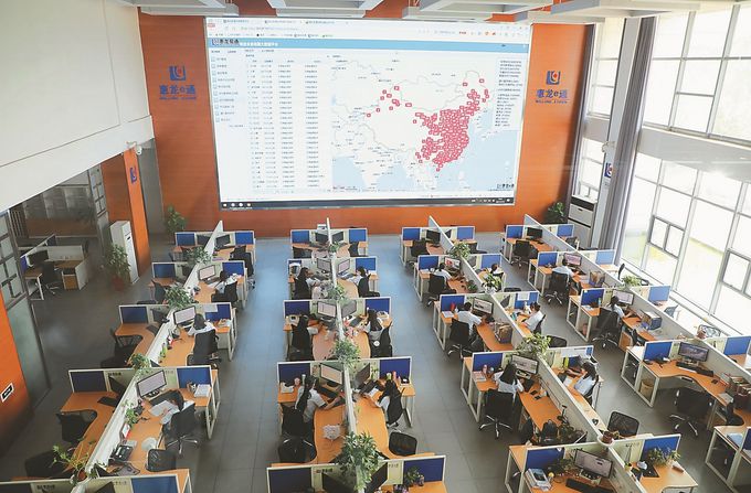 在惠龙易通信息数据中心,近百名员工正在电脑前处理物流订单,墙面上巨大的电子屏滚动显示着全国各地的即时交易信息。通过这张“全国物流全息地图”,可以快速查找会员信息、运价指数等,同时,在北斗定位技术的加持下,还可以实时监控货运车辆行驶状况。