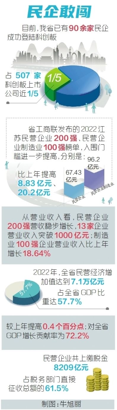 勇立实业潮头,争当奋楫搏浪的“水手”,另一份榜单同样能佐证江苏民企的勇毅前行。去年9月,省工商联发布2022江苏民营企业200强、民营企业制造业100强榜单,入围门槛进一步提高,分别达67.43亿元、96.2亿元,比上年提高8.83亿元、20.2亿元。从营业收入看,民营企业200强营收稳步增长,13家企业营业收入突破1000亿元;制造业100强企业营业收入比上年增长18.64%。