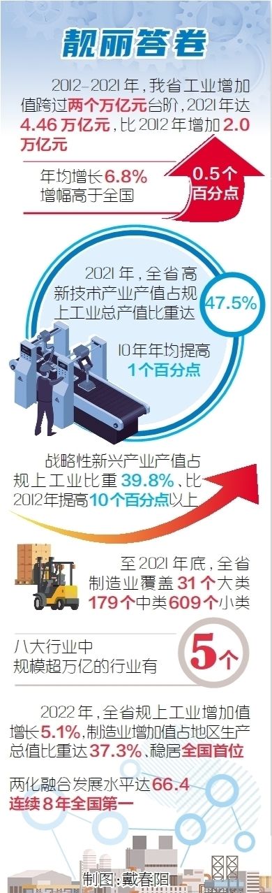 制造业规模实力保持领先。我省把制造业高质量发展摆在更加突出位置,加快传统产业转型和战略性新兴产业发展,推进产业迈向中高端水平。工业增加值10年跨过3万亿、4万亿两个台阶,2021年达4.46万亿元,比2012年增加2.0万亿元,年均增长6.8%,增幅高于全国0.5个百分点。