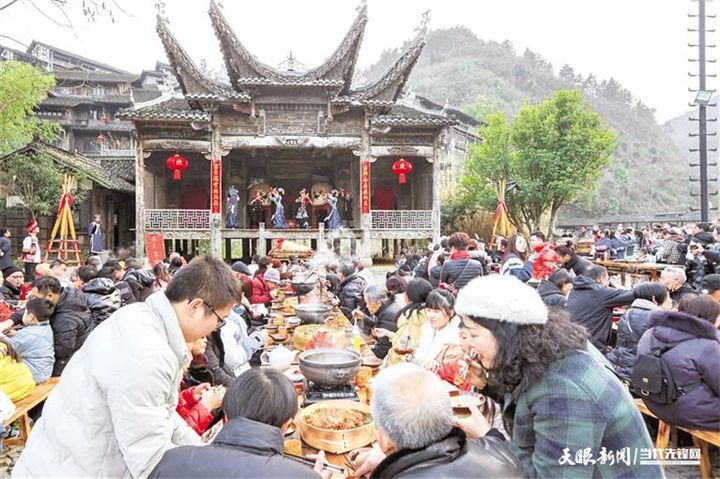 游客在乌江寨国际旅游度假区参加寨主家宴,欣赏文娱节目。 李仁军 摄(贵州图片库发)