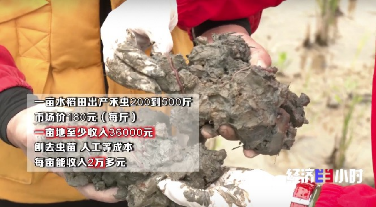 林家如去年试验了6亩地,收成不错。今年两百亩地要全部投进高端丝苗米香稻加禾虫养殖。林家如告诉记者,根据不同的试验地块,一亩水稻田可以出产禾虫200斤到500斤,按照市场价一斤180元计算,一亩地至少收入36000元,除了虫苗、人工等成本,每亩能收入2万多元。