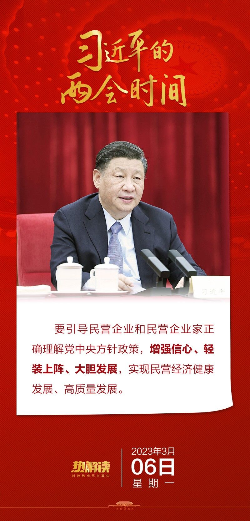 热解读 3月6日下午,习近平总书记亲切看望了参加全国政协十四届一次会议的民建、工商联界委员,并参加联组会,听取意见和建议。联组会上,总书记鼓励广大民营企业家“增强信心、轻装上阵、大胆发展,实现民营经济健康发展、高质量发展”。