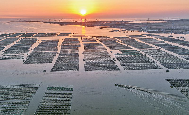 近年来,山东省荣成市大力推行科技兴海、以养兴渔,积极推广“浅海多营养层次生态养殖模式”。图为石岛管理区桑沟湾海洋牧场网箱养殖区(2023年2月16日摄)。 人民图片 李信君/摄