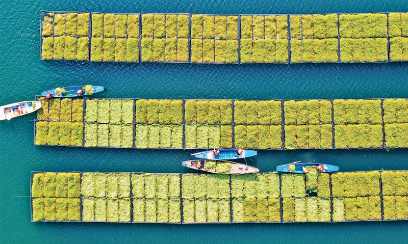浙江省杭州市淳安县在千岛湖典型库湾、入湖口等区域,运用生态浮岛水上无土栽培技术种植水生蔬菜,努力探索“两山”价值转化新路径。图为2023年2月21日,工作人员正在采摘水生蔬菜。 人民图片 杨波/摄