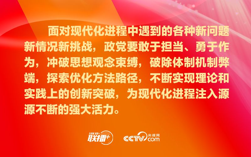 政党要把自身建设和国家现代化建设紧密结合起来,踔厉奋发,勇毅笃行,超越自我,确保始终有信心、有意志、有能力应对好时代挑战、回答好时代命题、呼应好人民期盼,为不断推进现代化进程引领方向、凝聚力量。