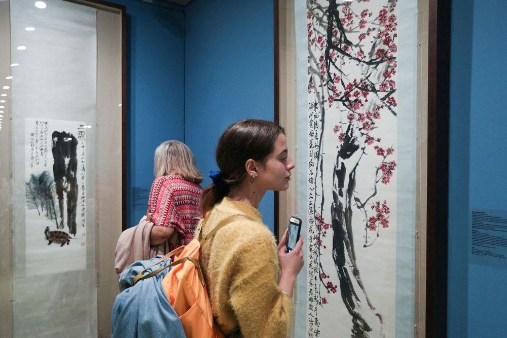 △观众在希腊雅典塞奥哈拉基斯艺术基金会美术馆观看中国的艺术展。