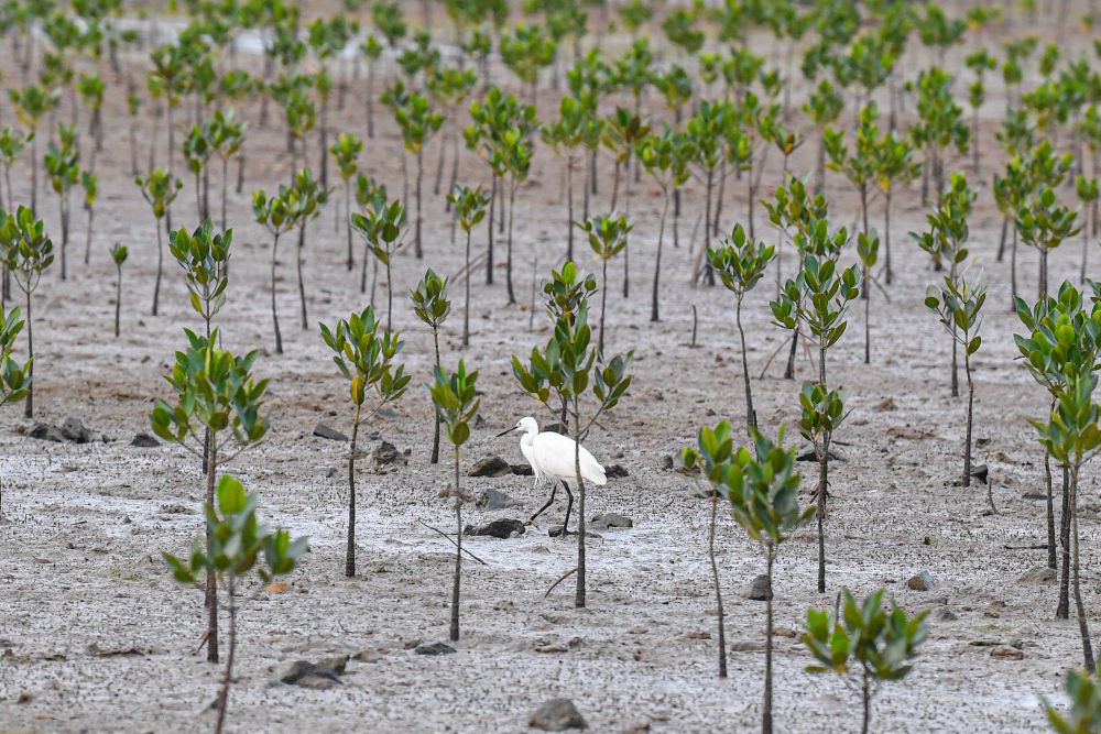 ↑鹭鸟在海南儋州市新英盐场湿地人工栽种的红树林间觅食(2022年11月8日摄)。