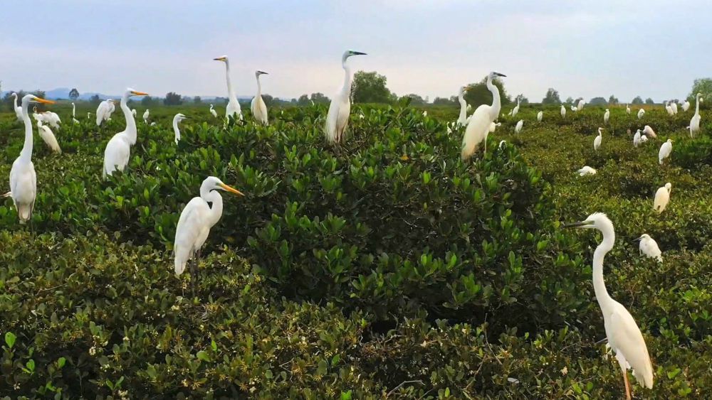 ↑在广西山口红树林生态国家级自然保护区,鸟儿在红树林中栖息(2022年8月22日摄,无人机照片)。