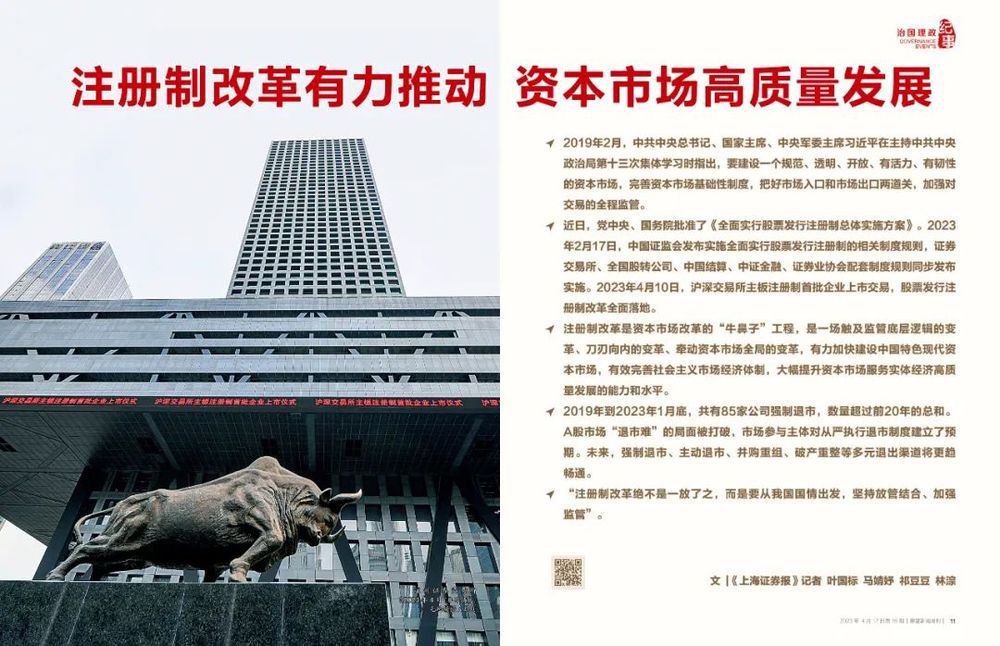 ◆ 注册制改革是资本市场改革的“牛鼻子”工程,是一场触及监管底层逻辑的变革、刀刃向内的变革、牵动资本市场全局的变革,有力加快建设中国特色现代资本市场,有效完善社会主义市场经济体制,大幅提升资本市场服务实体经济高质量发展的能力和水平。