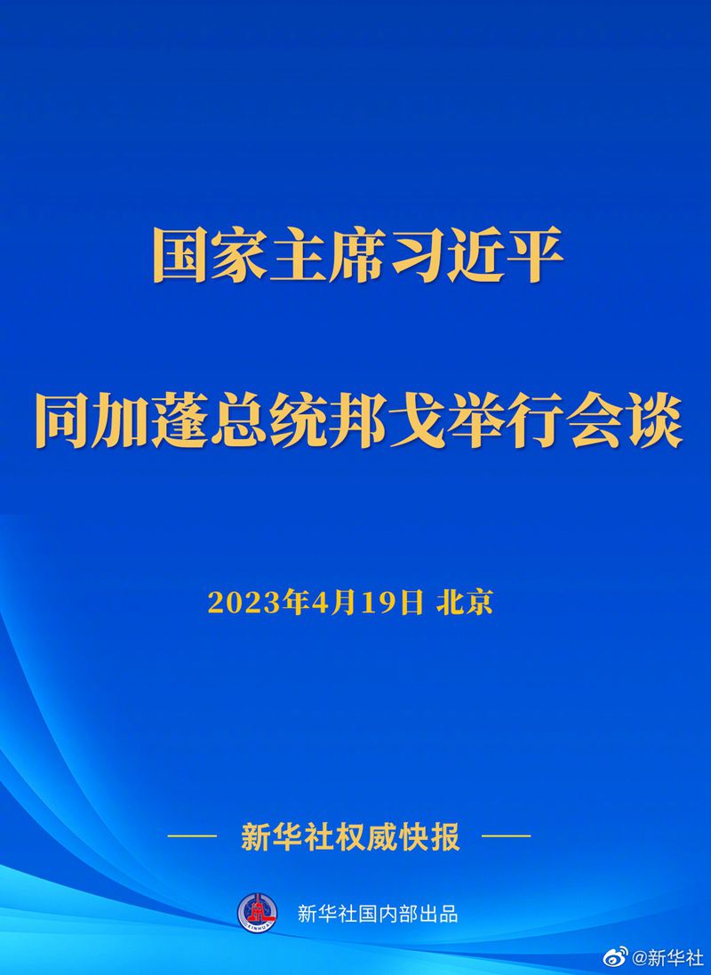 习近平欢迎邦戈总统访华。习近平指出,你是中国人民的老朋友,很高兴再次同你会面。总统先生是我再次当选国家主席后接待的首位非洲国家元首,这充分体现了中加关系的重要性和高水平。近年来,在总统先生领导下,加蓬积极探索适合本国国情的发展道路,致力于促进国家稳定和经济多元化,国家建设取得重要成就。加方还大力推动地区一体化进程,积极斡旋非洲热点问题,成功举办“一个森林”峰会,不久前接任中部非洲国家经济共同体主席国,国际和地区影响力显著提升。作为加蓬的真诚朋友,我们衷心祝愿加蓬各项事业取得更大进步,早日实现建成“新兴加蓬”战略目标。
