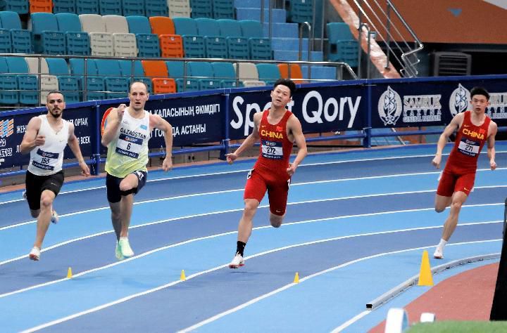 2月11日,樊添瑞(右二)在哈萨克斯坦首都阿斯塔纳举行的2023亚洲室内田径锦标赛男子400米决赛中以47秒30的成绩排名第三,夺得铜牌。新华社发(奥斯帕诺夫摄)