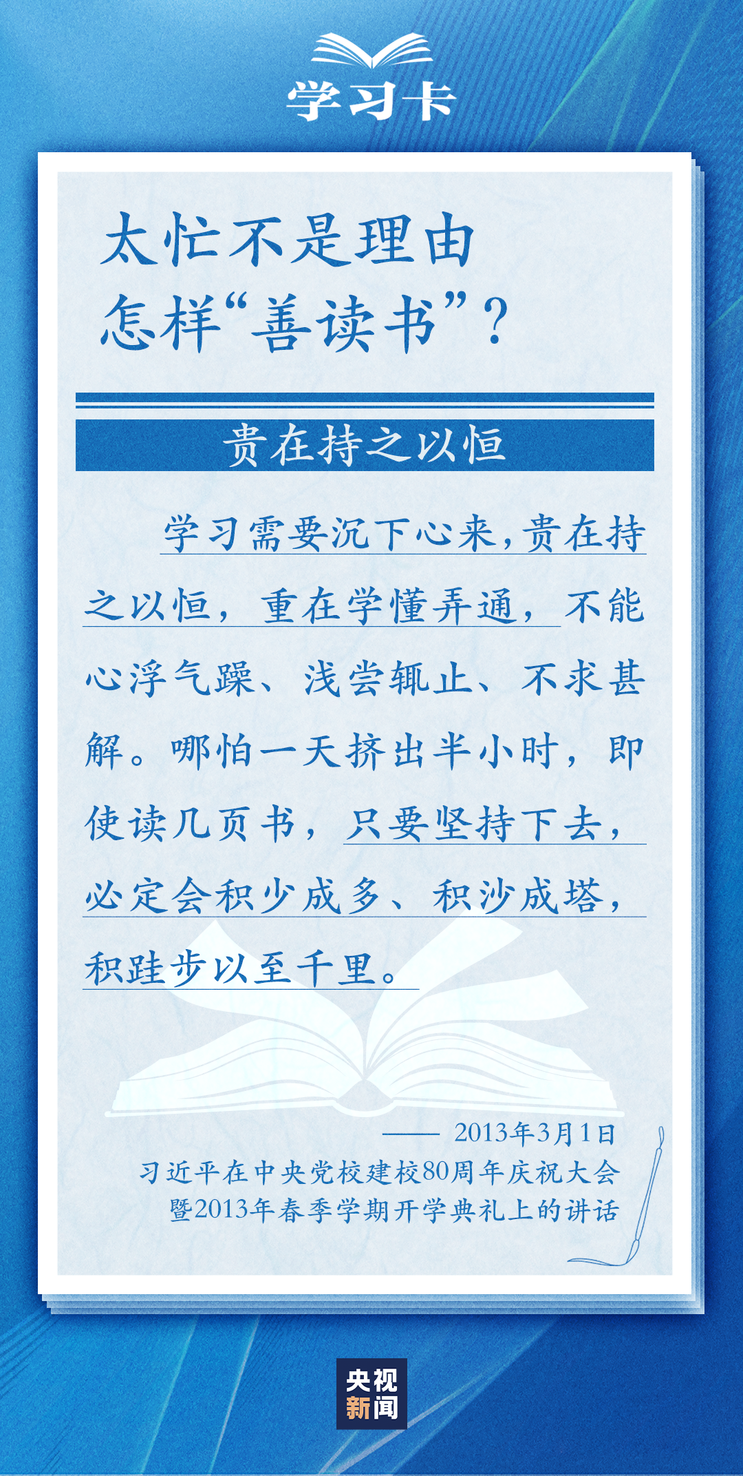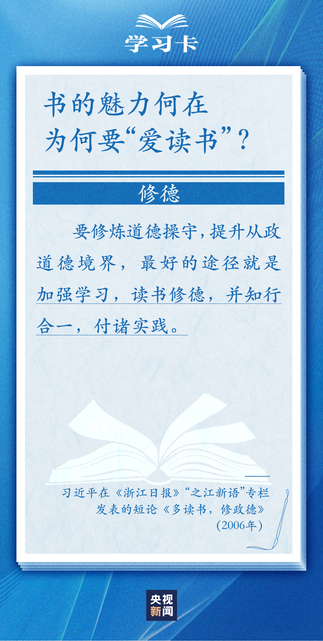 今天(4月23日)是世界读书日。习近平曾多次讲述和书籍的不解之缘,分享读书学习的感悟,倡导“爱读书、读好书、善读书”。书的魅力何在,为何要“爱读书”?如何能“选好书”?怎样“善读书”?一起学习↓