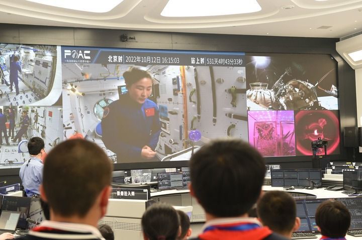 2022年10月12日,在中科院空间应用工程与技术中心地面主课堂,学生收看“天宫课堂”第三课。新华社记者 罗晓光 摄