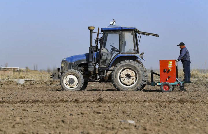 2023年3月3日,在宁夏银川市贺兰县立岗镇银星村,一台装有北斗导航系统的无人驾驶播种机进行播种作业。新华社记者 冯开华 摄