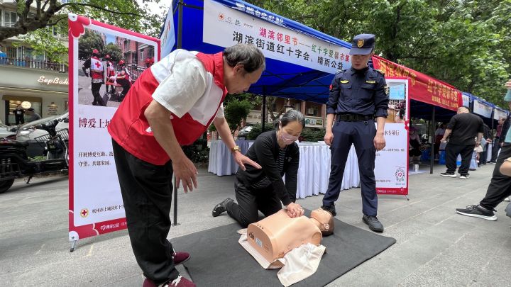 上城区红十字志愿者在对市民进行心肺复苏培训。
