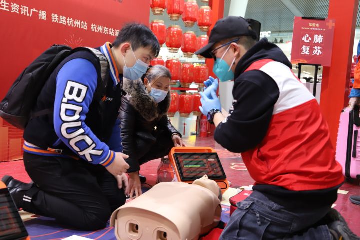 志愿者在杭州火车东站对即将上车的旅客进行应急救护培训。