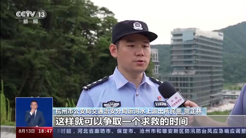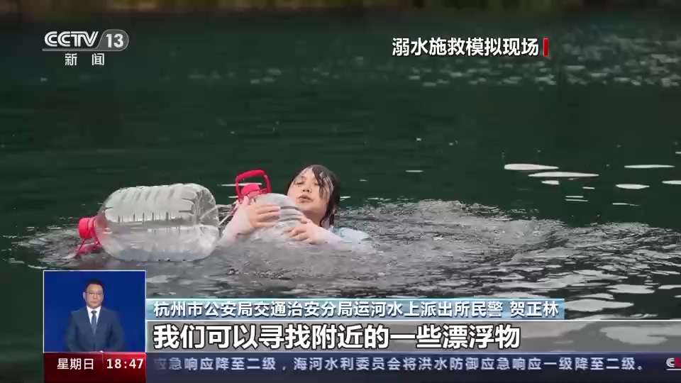 杭州市公安局交通治安分局运河水上派出所民警 贺正林:我们可以寻找附近的一些漂浮物,比如泡沫、水壶以及一些树枝等都可以扔给落水者,这样的话,他可以漂浮在水面上等待其他人员的救援。