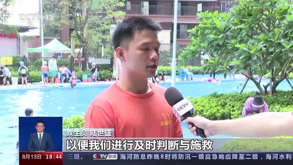 救生员 陆世盛:我们救生员都有一种很敏锐的判断,看到小朋友在救生圈上玩耍,一旦翻下来,我们就知道他容易溺水。还有,现在小朋友的泳衣不够显眼,我们时刻盯着泳池看,建议家长给孩子买颜色鲜艳、与水面反差比较大的泳衣,以便我们进行及时判断与施救。