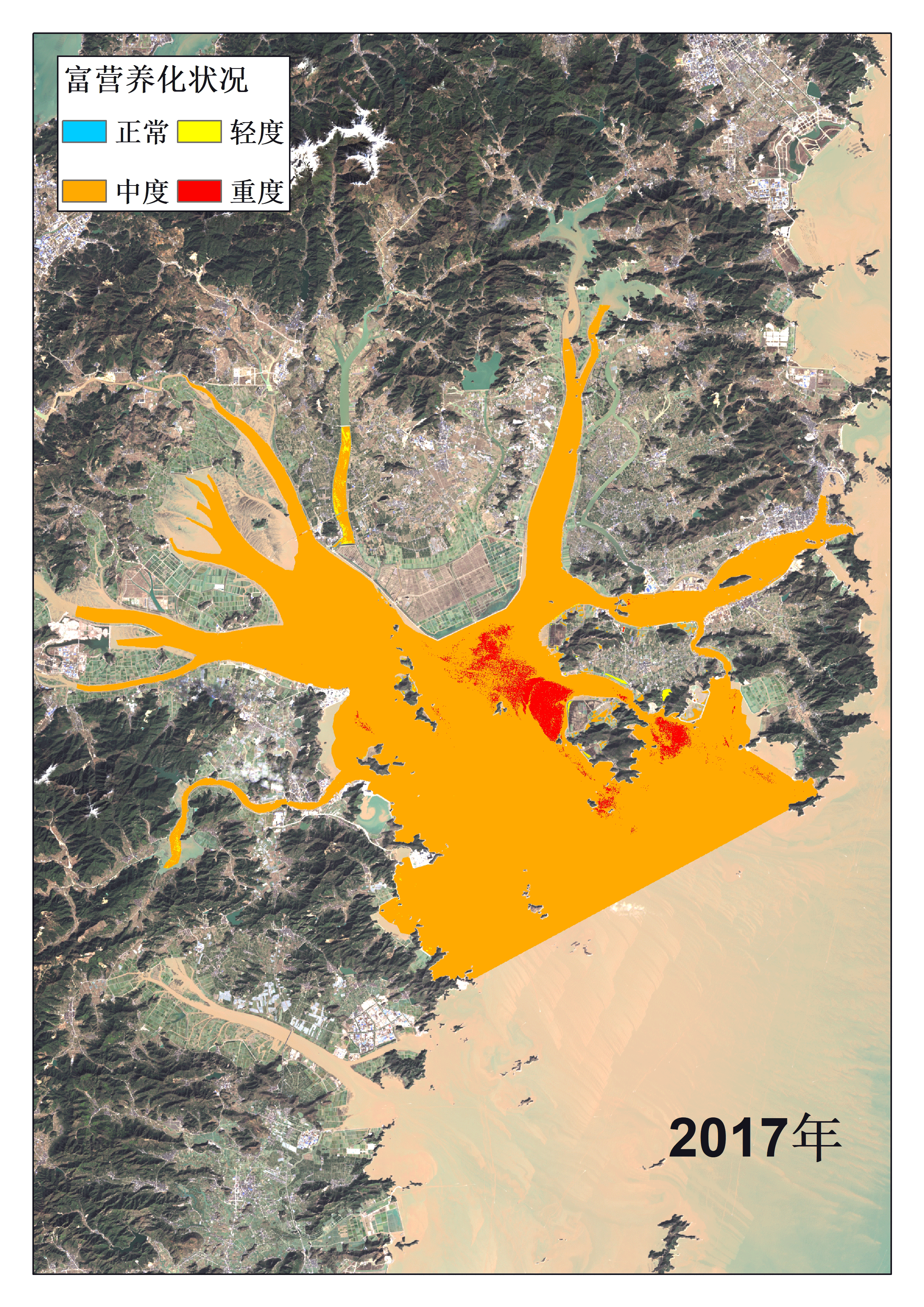 (2017-2022年三门湾春季富营养化监测结果动态图,由浙江省生态环境监测中心遥感监测研究所提供)在我省“五水共治”大背景下,乐清、台州等沿海地区,展开一系列生态治理与修复工程,乐清湾水体营养盐浓度降低,富营养化程度得到改善;三门湾全域水体富营养化程度改善显著,大部分重度富营养化区域已经降至中度和轻度富营养化。