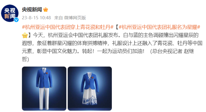 杭州亚运会日益临近,8月15日,中国体育代表团礼服发布。