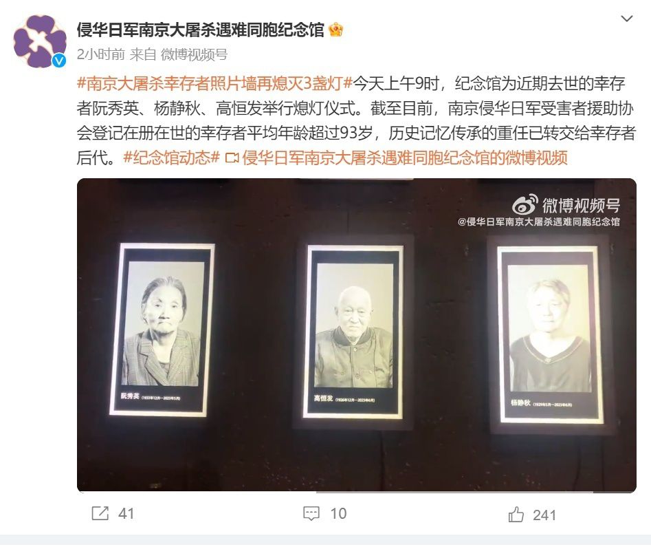 纪念馆为近期去世的幸存者阮秀英、杨静秋、高恒发举行熄灯仪式。