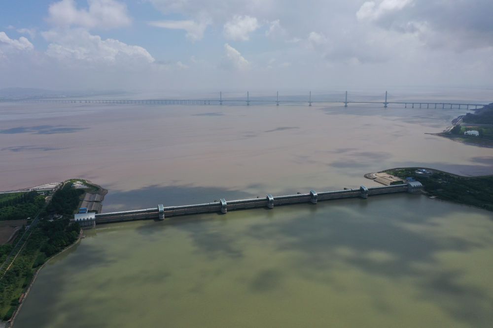 曹娥江大闸是我国强涌潮河口地区第一大闸,浙东水资源配置重要枢纽工程(8月4日摄,无人机照片)。新华社记者 黄宗治 摄