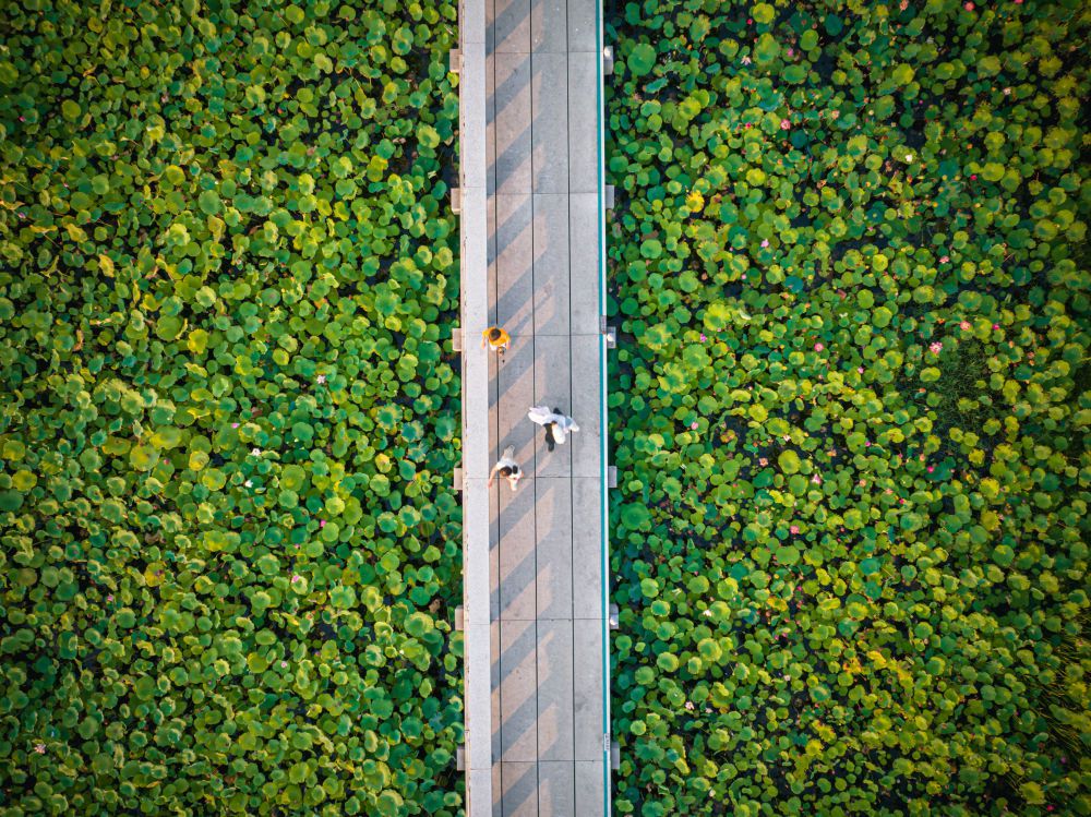 市民在杭州市上城区丁兰街道桃花湖公园内游玩(8月12日摄,无人机照片)。桃花湖公园占地300亩,是一个由工业园区改造成的复合型城市功能生态公园。新华社记者 江汉 摄