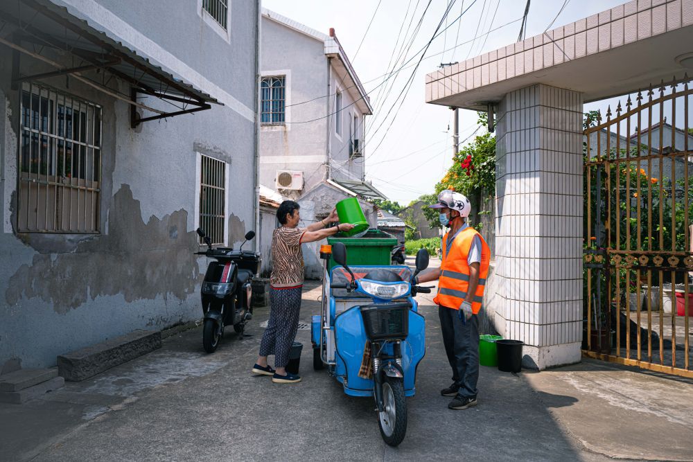 宁波市江北区外漕村村民(左)进行垃圾分类投放(8月11日摄)。新华社记者 江汉 摄