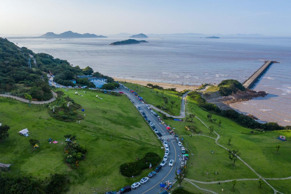 鸟瞰梅山湾沙滩公园(8月9日摄,无人机照片)。宁波市北仑区通过“陆海统筹、河海兼顾、上下联动、智慧蓝碳”治理新模式,累计投入21亿元,使曾经“海水常年混浊,泥路和荒滩遍布”的梅山湾变为一片蓝色海湾,用“金山银山”反哺“绿水青山”。新华社记者 黄宗治 摄