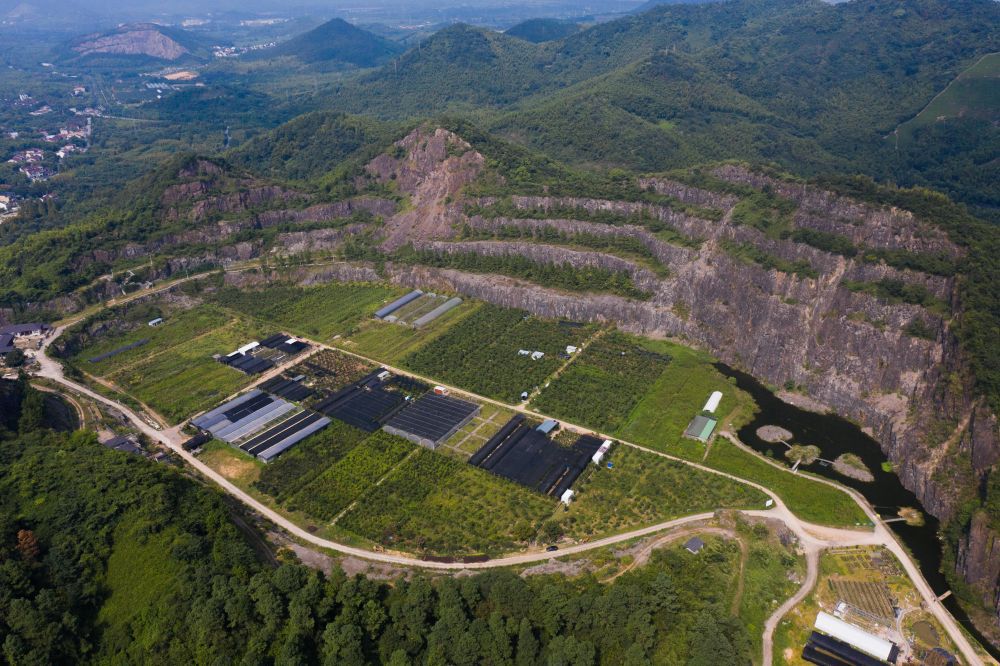 浙江省湖州市吴兴区东林镇三合村一处废弃矿山经过生态修复后成为花卉种植基地(8月14日摄,无人机照片)。新华社记者 徐昱 摄