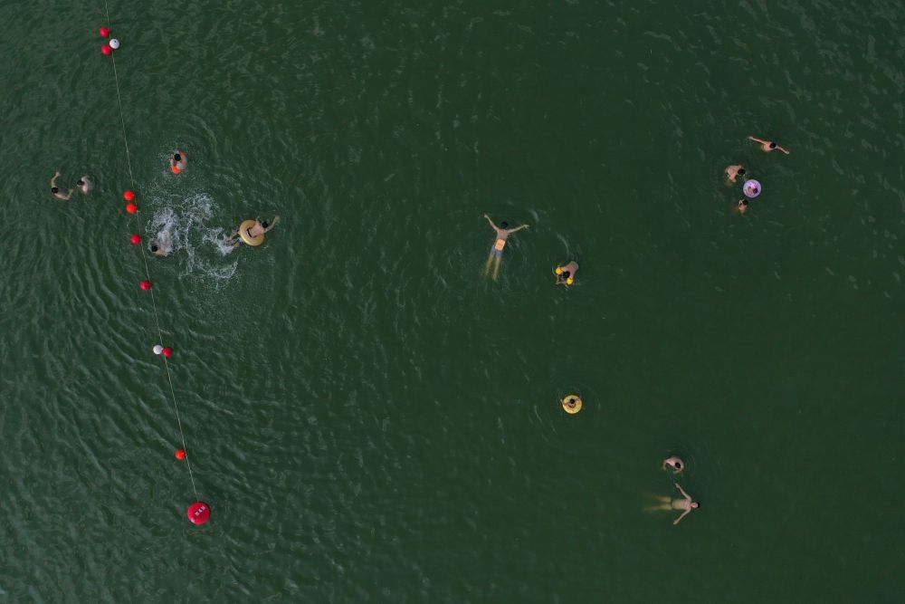 人们在流经奉化区溪口镇的剡江里游泳(8月11日摄,无人机照片)。新华社记者 黄宗治 摄