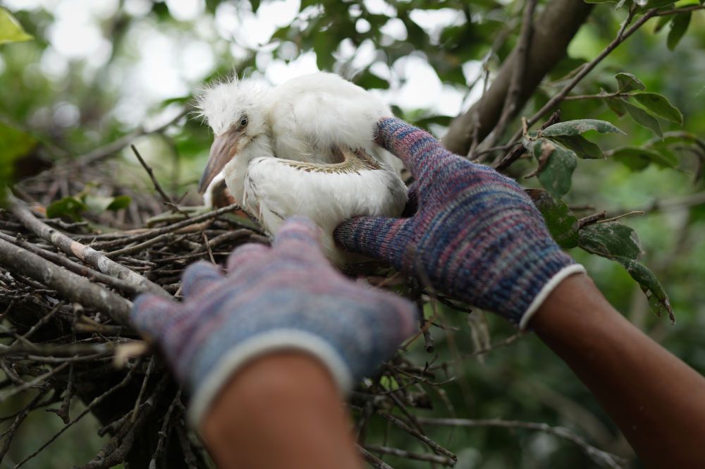 宁海湾海岛护鸟队员在一座岛上将落巢的白鹭幼鸟放回巢穴(6月13日摄)。浙东宁海湾是重要的鸟类栖息地,位于湾区的强蛟镇组建了由渔民、民警、党团志愿者等组成的海岛护鸟队,看护这片鸟类乐园。新华社记者 翁忻旸 摄