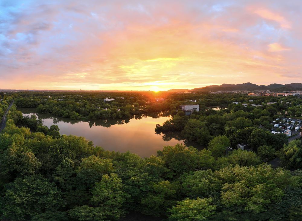 杭州市西溪湿地日出景观(7月31日摄,无人机照片)。新华社记者 翁忻旸 摄