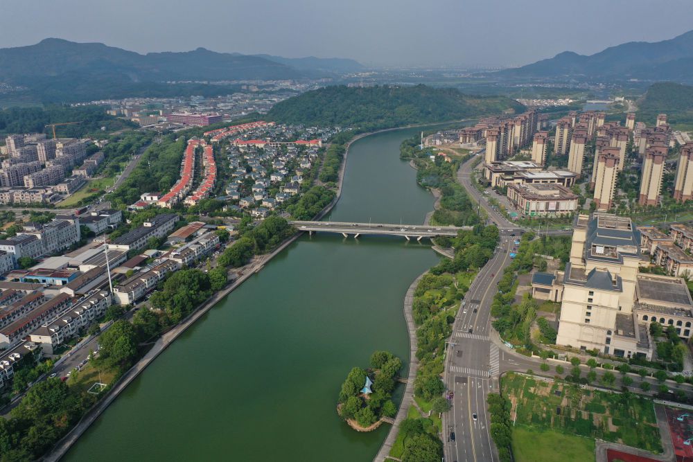 鸟瞰流经宁波市奉化区溪口镇的剡江(8月11日无人机照片)。新华社记者 黄宗治 摄