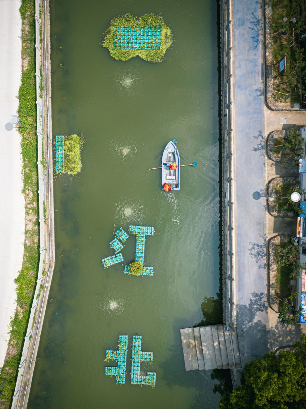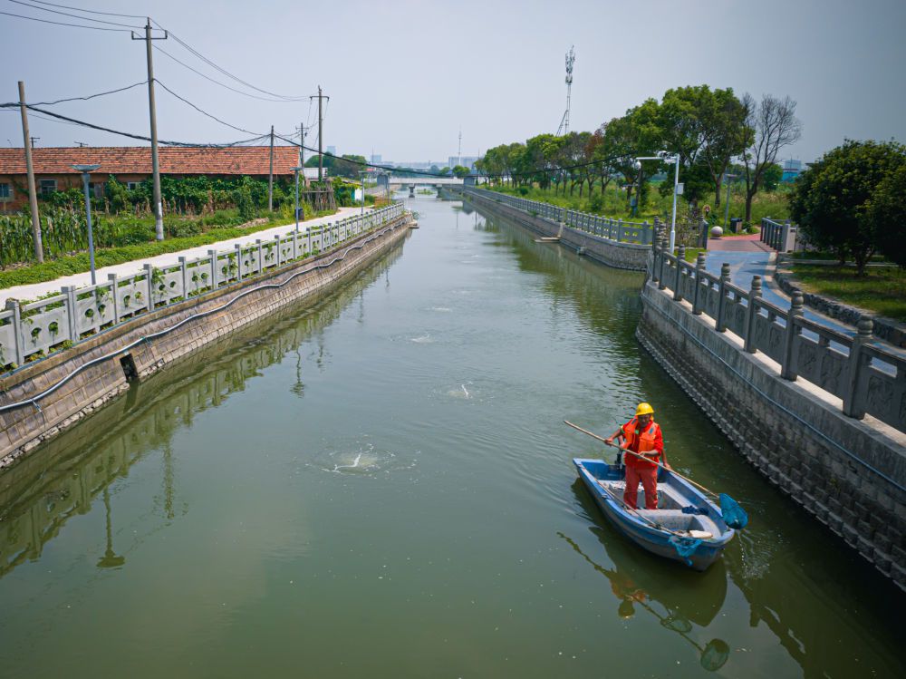 工作人员驾驶小船在宁波市江北区西大河上清理水面(8月11日摄,无人机照片)。近年来,宁波市江北区通过堤岸整治、河道清淤、建立微循环系统等方式,提高了西大河的水体自净能力和水生态环境。新华社记者 江汉 摄