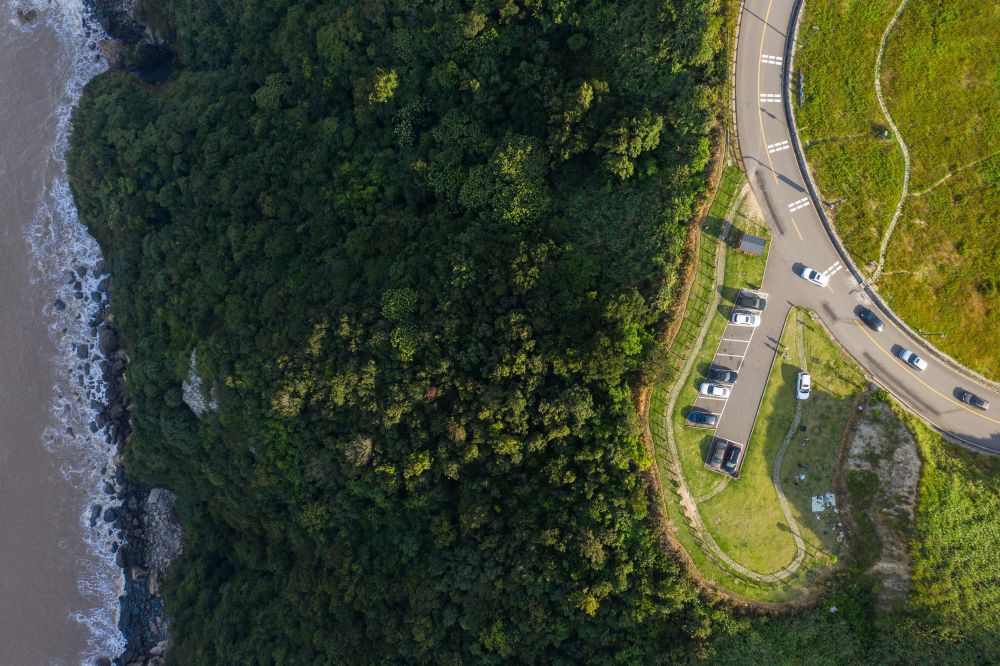 空中俯瞰临海而建的舟山普陀区螺塘线生态公路(8月6日摄,无人机照片)。螺塘线以“生态交通”为原则打造,将沿途的渔家村落、茶田、海滩、山坡、民宿等山海风光串连起来,移步换景,路景相依。新华社记者 徐昱 摄