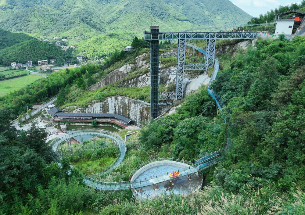 8月3日,游客在安吉县鄣吴镇利用废弃矿山改建的漂流点体验空中漂流。新华社记者 翁忻旸 摄