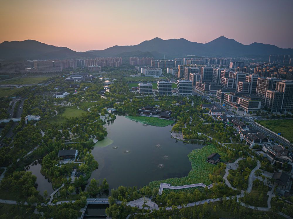 杭州市上城区丁兰街道桃花湖公园景色(8月12日摄,无人机照片)。桃花湖公园占地300亩,是一个由工业园区改造成的复合型城市功能生态公园。新华社记者 江汉 摄